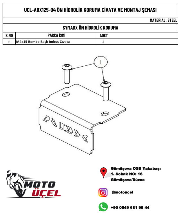 MOTO ÜÇEL Hidrolik koruma ST37 Metal sac malzemedir. Bağlantı aparatları ürün ile birlikte gönderilir. Yalnızca SYM ADX 125 modeli ile uyumludur.