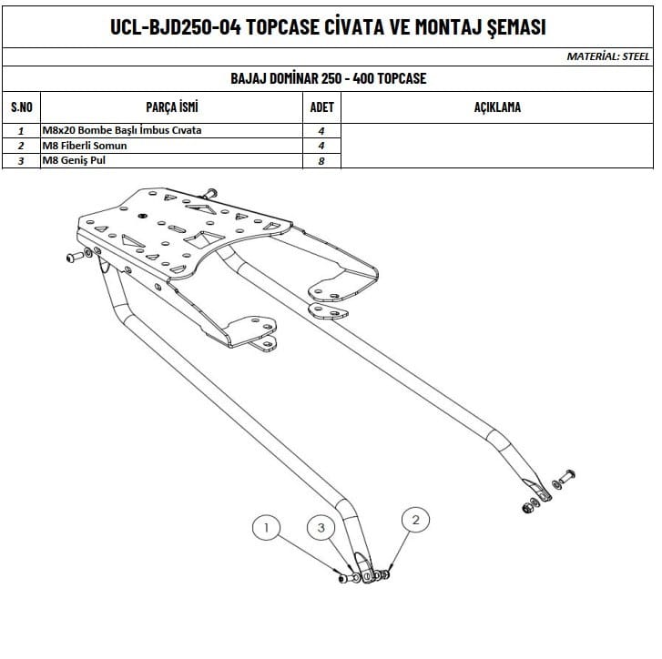 Çanta demiri, motosikletinizin stok halinde bulunmayan, seyahatlerde olmazsa olmaz topcase (çanta) sabitlemeye yarayan en önemli aksesuardır. MOTOÜÇEL motosiklet çanta demiri sayesinde çantalarınızı sabitleyerek güvenle yolculuk yapabilirsiniz. Ayrıca artçınızın arkasına yaslanarak rahat bir yolculuk yapmasını sağlar. Çok amaçlı kullanabileceğiniz şık görünüm sağlayacak bir üründür.