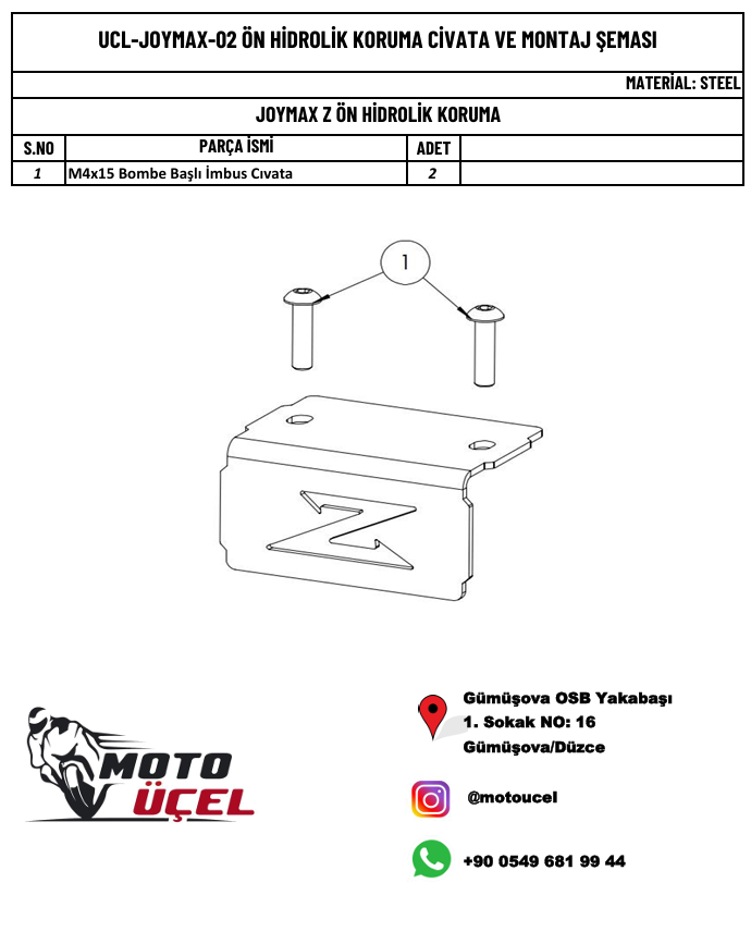 MOTO ÜÇEL Hidrolik koruma ST37 Metal sac malzemedir. Bağlantı aparatları ürün ile birlikte gönderilir. Yalnızca SYM JOYMAX Z 250 modeli ile uyumludur.
