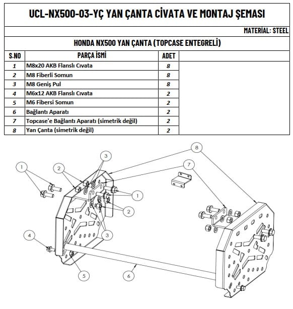GÖRSELDEKİ SADECE YAN ÇANTA DEMİRLERİ GÖNDERİLMEKTEDİR. MOTOÜÇEL ÇANTA DEMİRİ MEVCUT İSE UYUMLUDUR. DİĞER ÇANTA DEMİRLERİNE UYUMLU DEĞİLDİR.