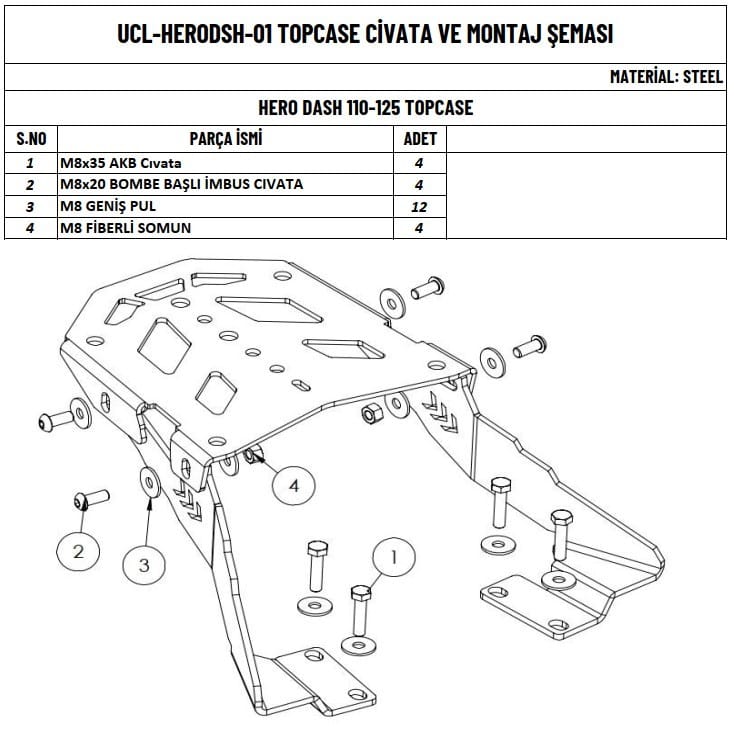 Çanta demiri, motosikletinizin stok halinde bulunmayan, seyahatlerde olmazsa olmaz topcase (çanta) sabitlemeye yarayan en önemli aksesuardır. MOTOÜÇEL motosiklet çanta demiri sayesinde çantalarınızı sabitleyerek güvenle yolculuk yapabilirsiniz. Ayrıca artçınızın arkasına yaslanarak rahat bir yolculuk yapmasını sağlar. Çok amaçlı kullanabileceğiniz şık görünüm sağlayacak bir üründür.