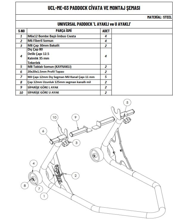 Universal kaldırma sehpası sayesinde motosikletinizin stok aksesuarları arasında olmayan orta sehpa eksiğinizi gidermiş olup, motorunuzu daha güvenli park edebilir, zincir yağlama vs gibi onarım ve bakım işlemlerinizi kolay bir şekilde tamamlayabilirsiniz. Kaliteli malzeme ve ham madde kullanılması sebebiyle uzun yıllar kullanabilirsiniz.